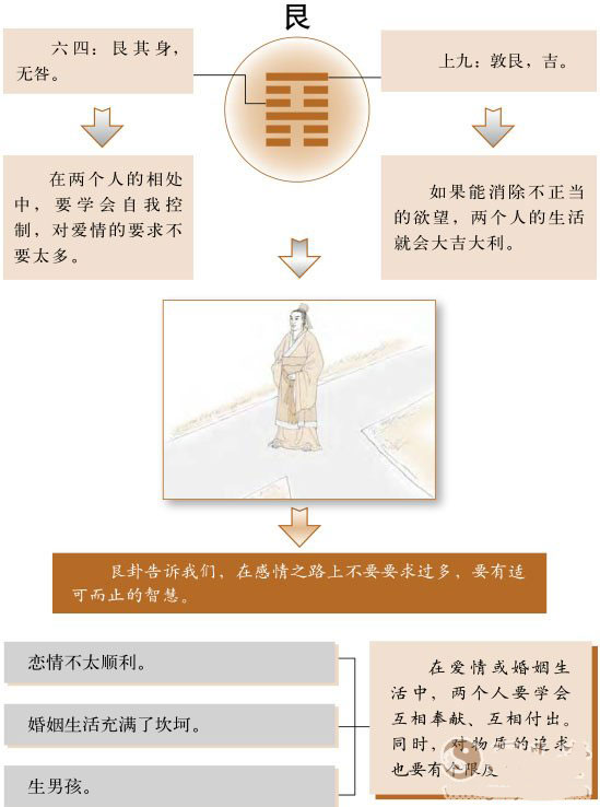 艮卦是两座山重叠在一起,表示阻止。人的精力是有限的,在爱情或婚姻中,要学会有所不为、适可而止的智慧。追求精神生活可以弥补物质生活上的缺憾,并且带来更多的幸福。 [详细] |